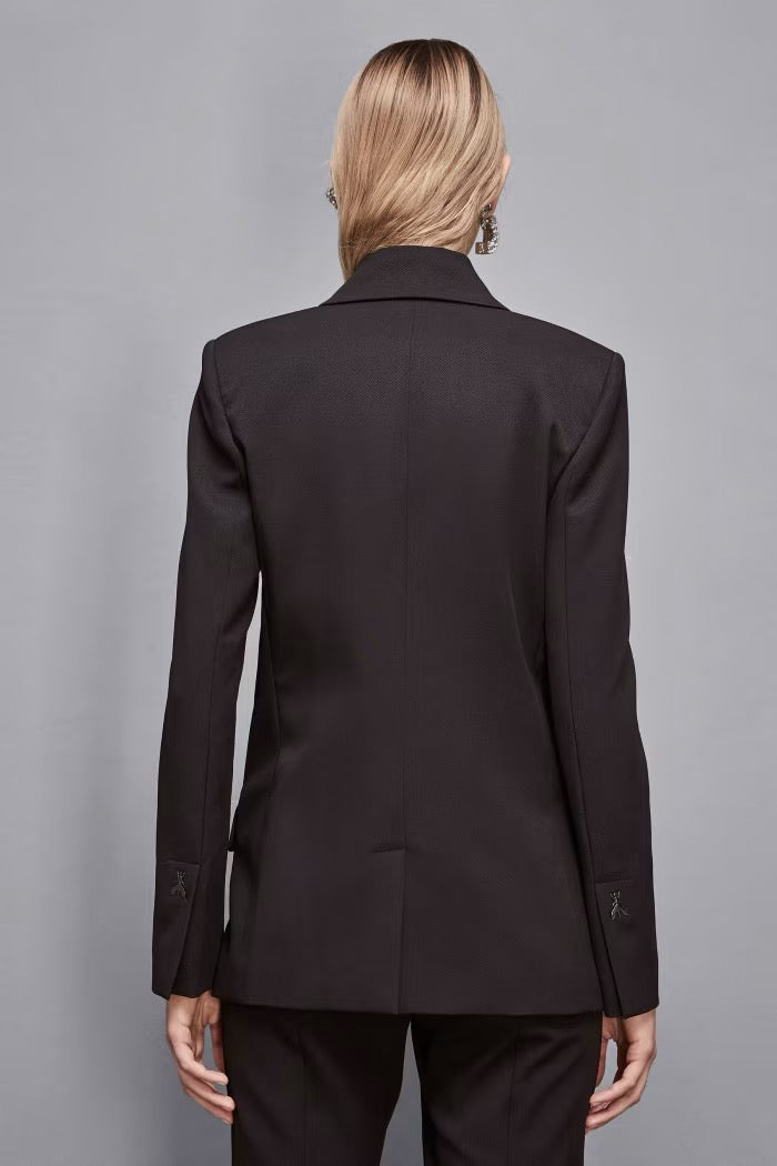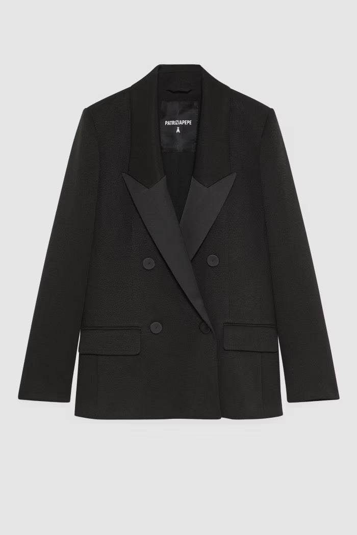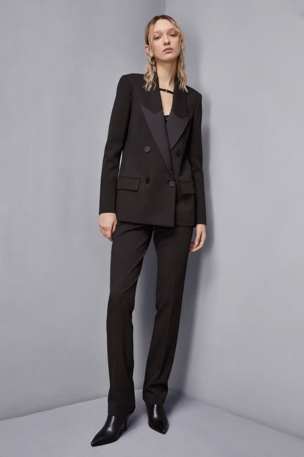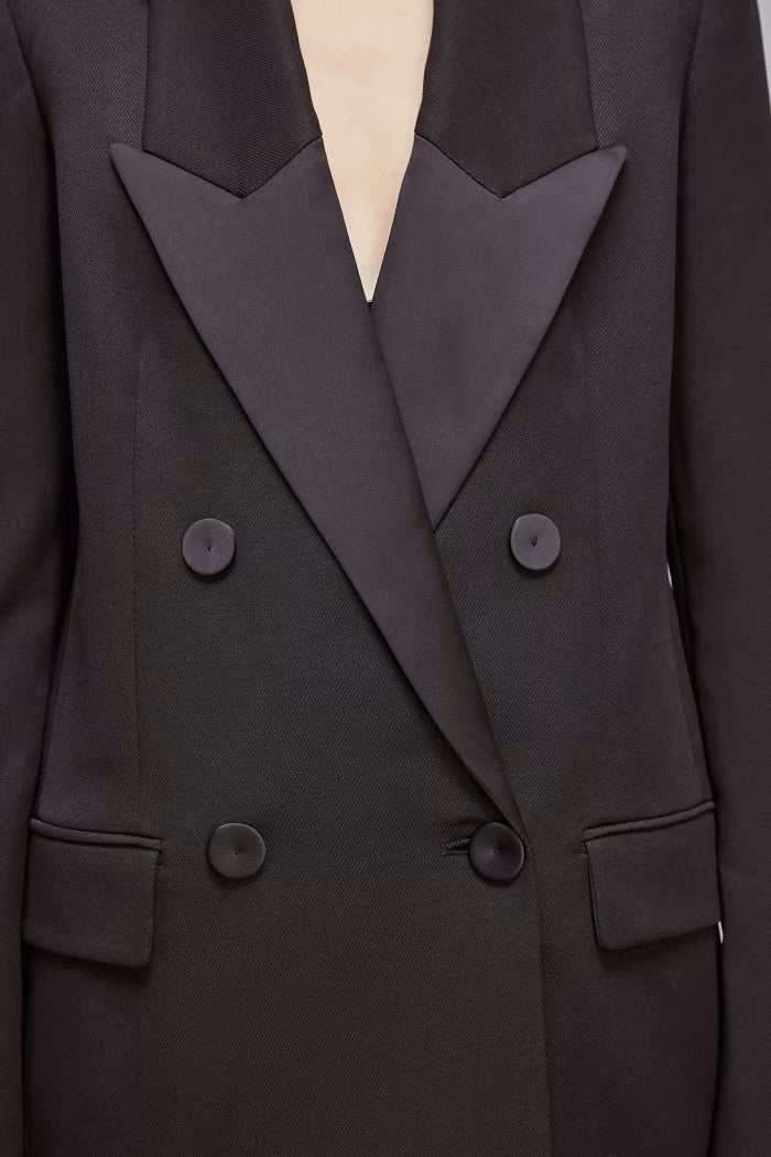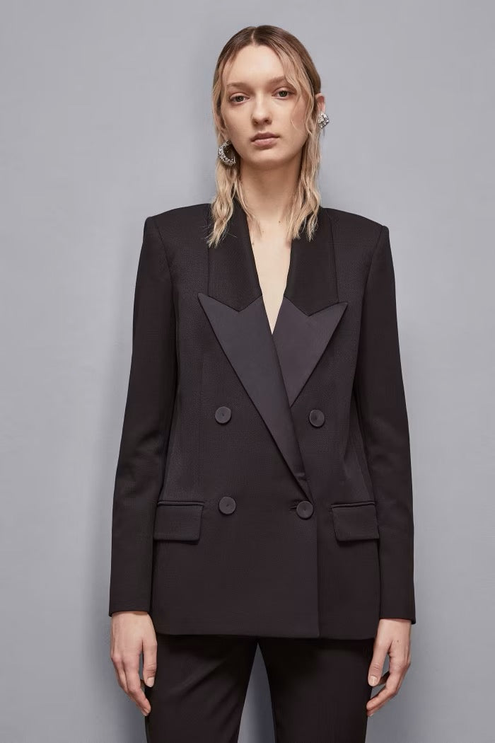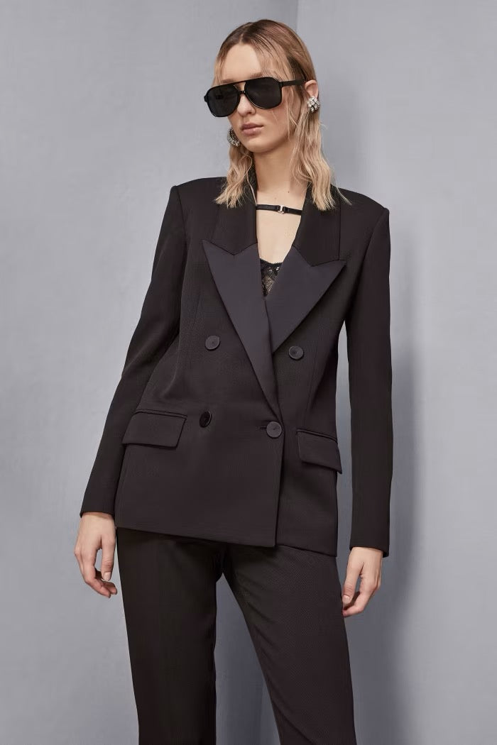 Elegante e raffinata, questa giacca smocking doppio petto, con vestibilità maschile e spalla strutturata, è arricchita dai rivetti Fly sui polsi per un tocco unico e moderno.