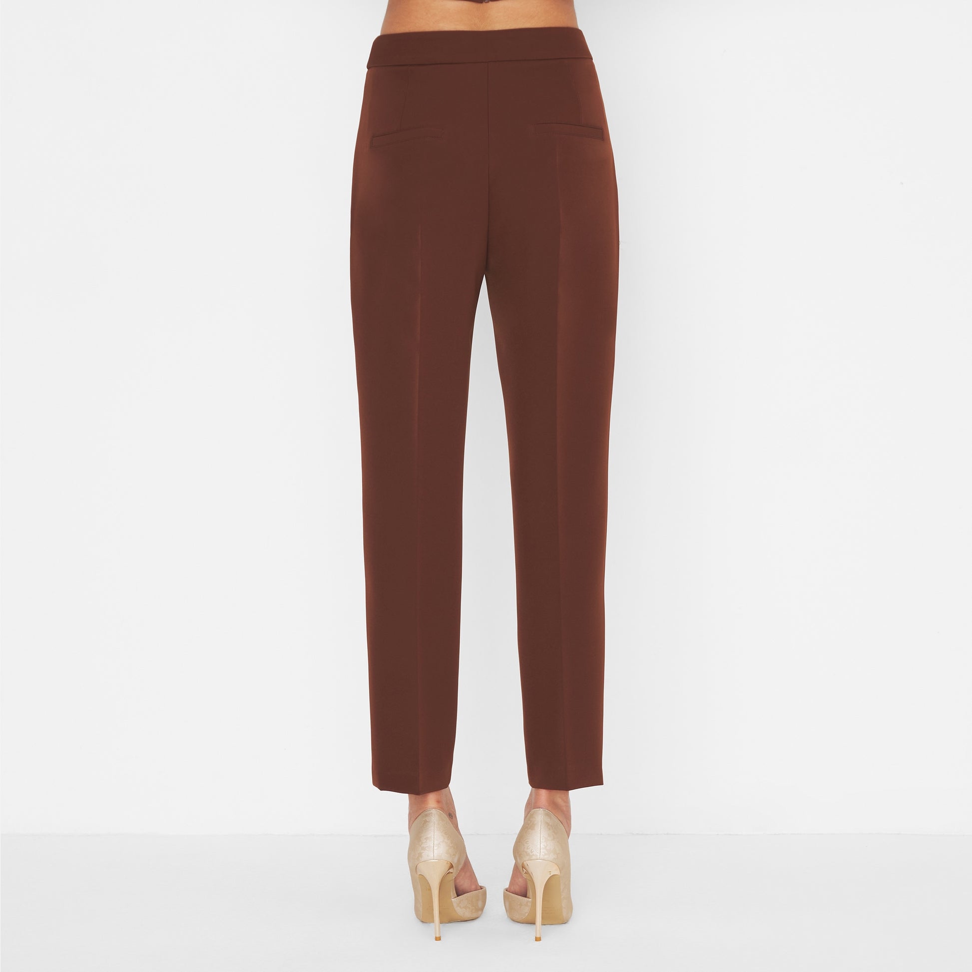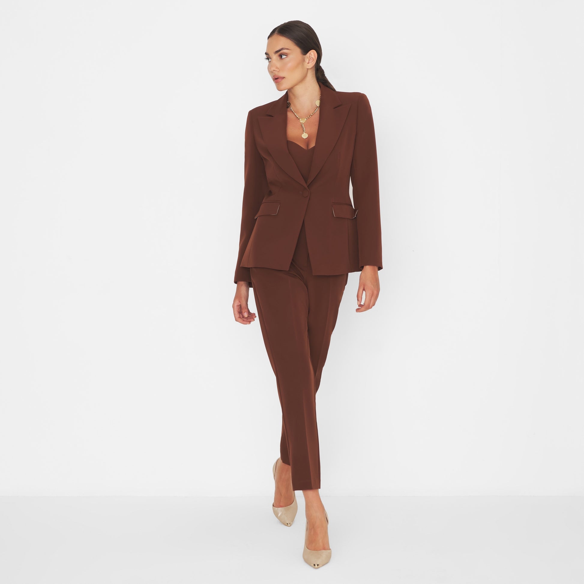 La vita alta e la gamba dritta slanciano la figura, mentre la tonalità marrone caldo cioccolato aggiunge un tocco raffinato e moderno. Versatile e sofisticato, è ideale sia con una camicia elegante per l’ufficio che con un top per un look serale chic.