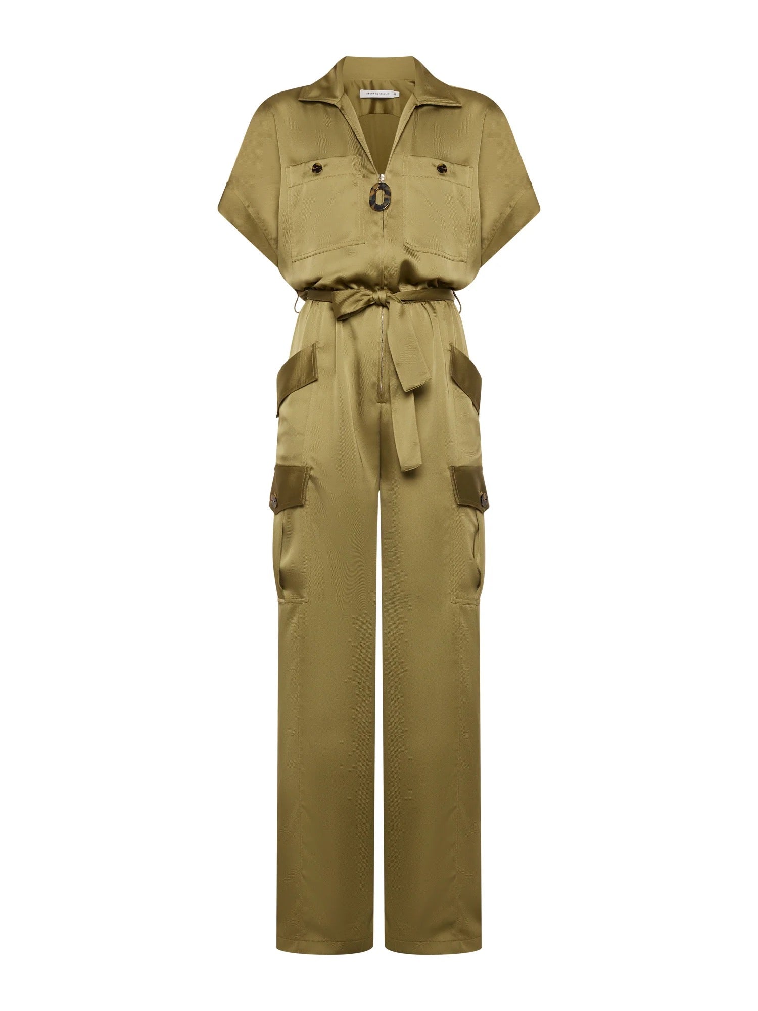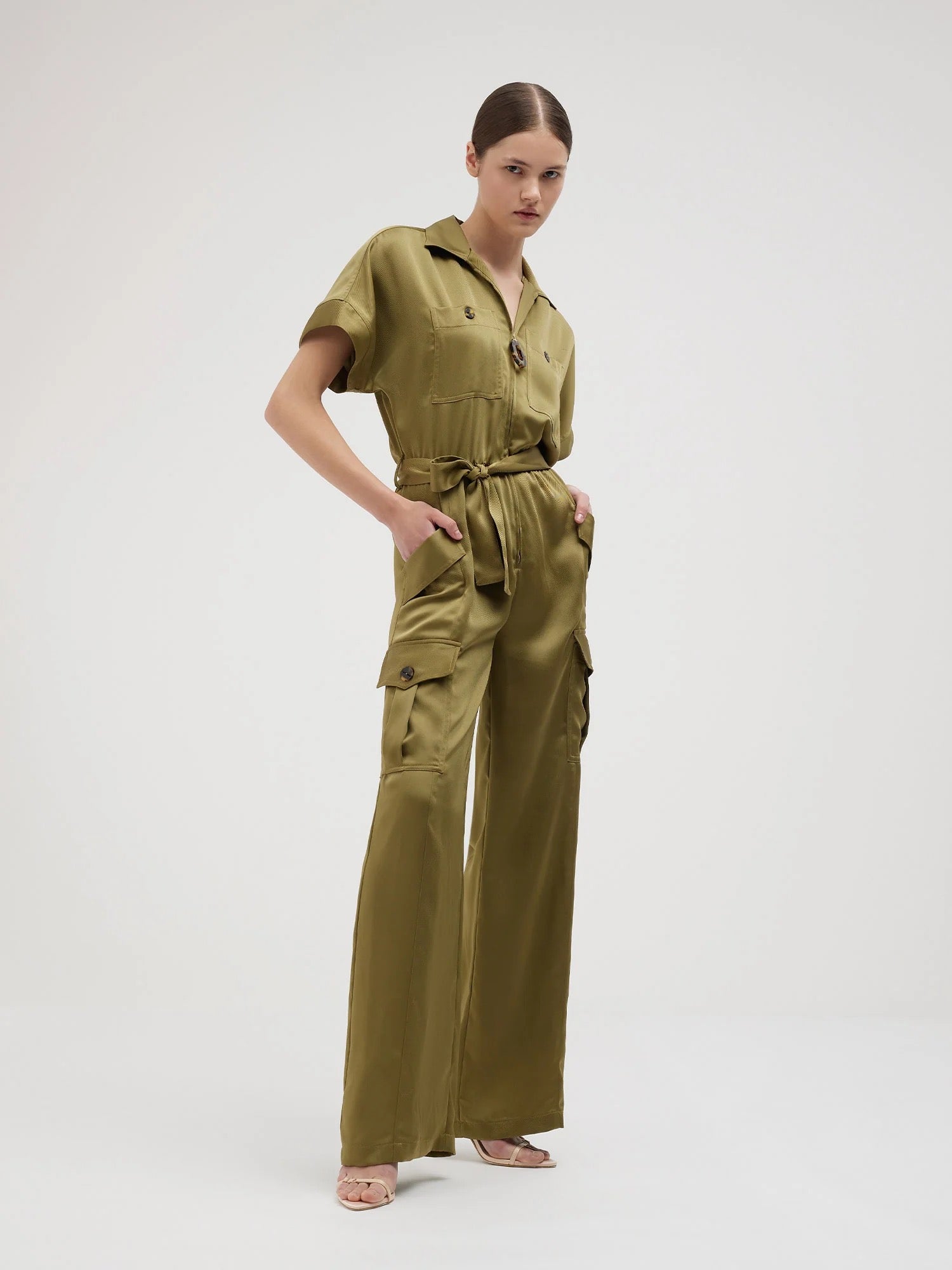Tuta in cavallery fluido con cintura in vita, tasche e bottoni in leopard plasticAltezza modella: 178 cm - Taglia indossata IT40